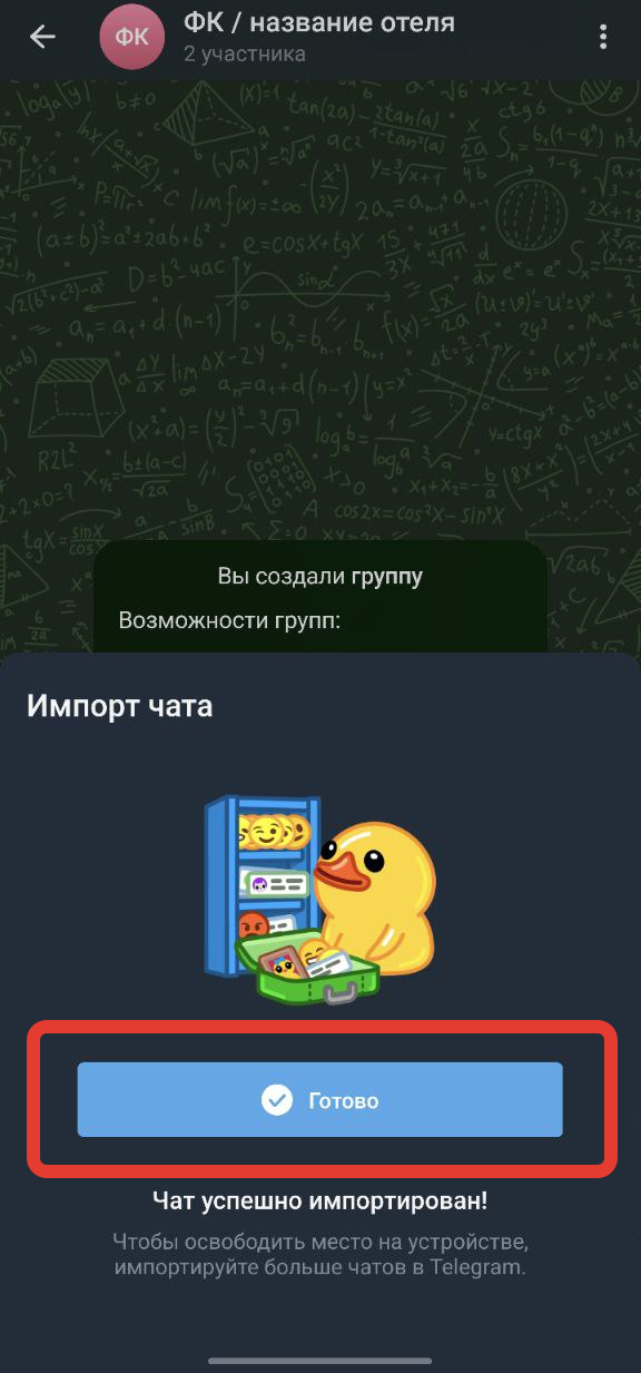- Дождитесь его завершения. Когда импорт закончится, появится уведомление «Чат успешно импортирован» или «Готово».