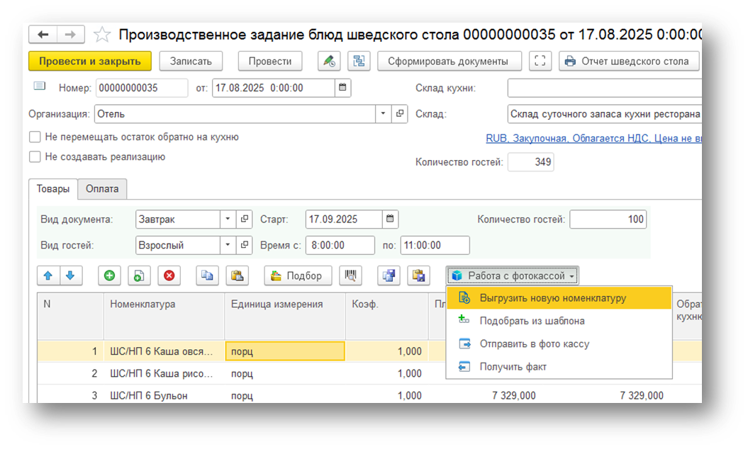 через документ «Произведённое задание блюд шведского стола».