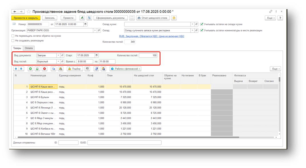 Подготовьте необходимые блюда и их количество для отправки в табличной части Товары, затем заполните необходимые параметры плана меню