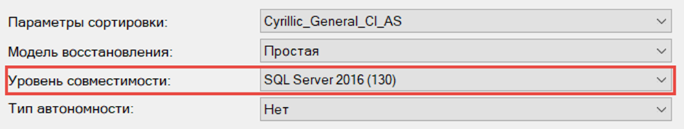 - Системные требования: Для обеспечения работоспособности интеграции требуется SQL Server 2016 или выше. Уровень совместимости базы данных в её свойствах должен быть установлен не ниже SQL Server 2016 (130).