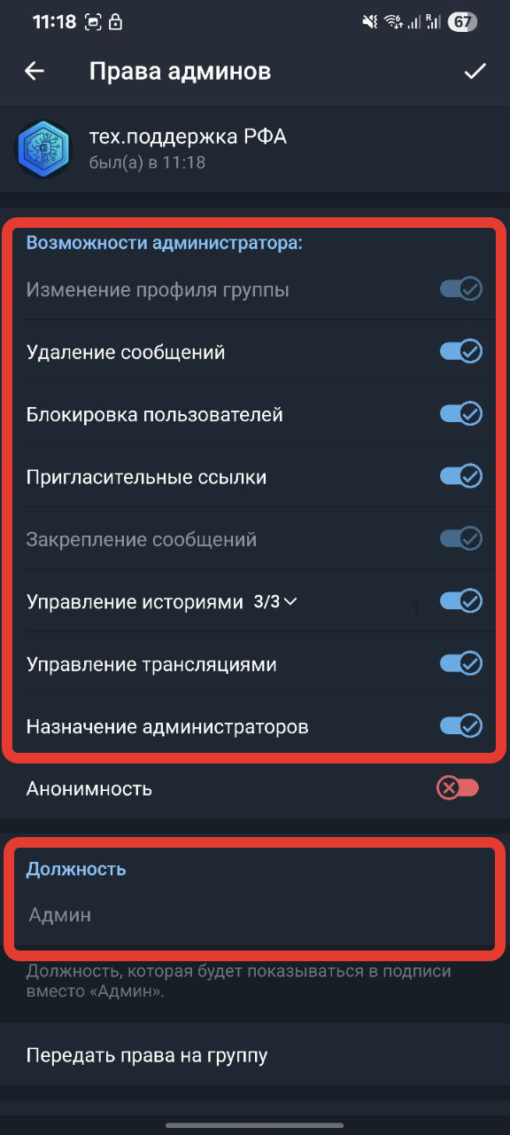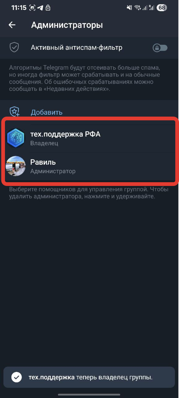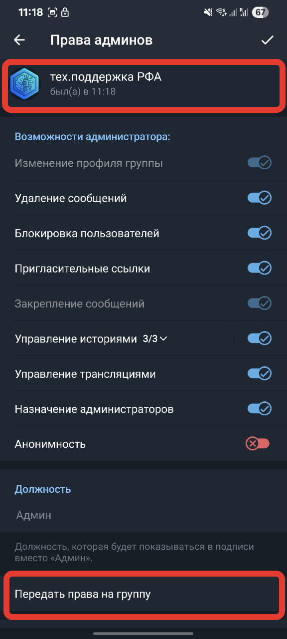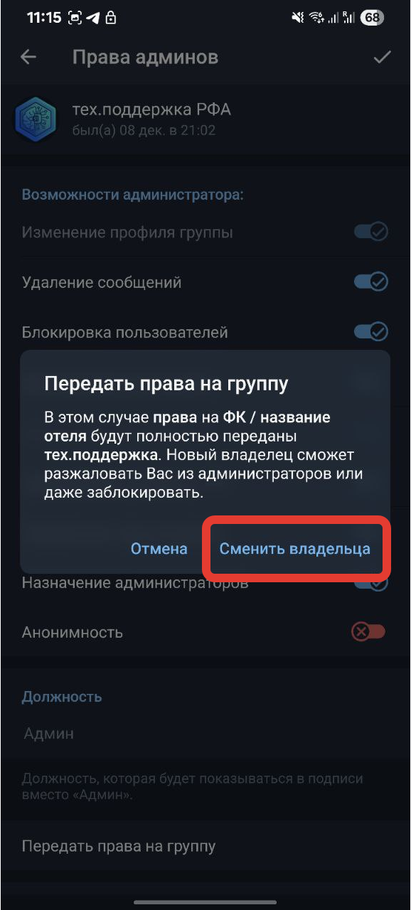 После передачи ваша роль будет "Администратор", а преданному "Владелец"